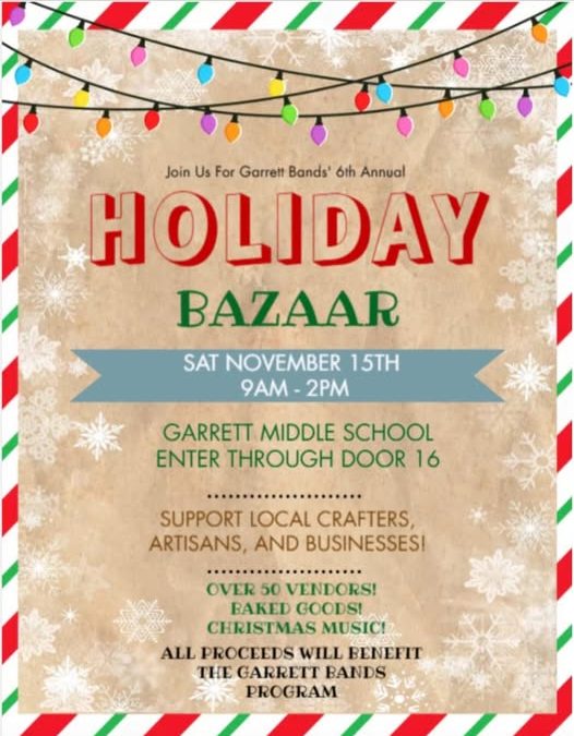 Garrett Band Boosters Holiday Bazaar, Saturday, November 15, 2025 0 comments 801 E. Houston Street, Garrett, IN from 9 AM to 2 PM. Enter thru Door 16 off Warfield Street Submit a Comment Cancel replyYour email address will not be published. Required fields are marked *Comment * Name * Email * Website Save my name, email, and website in this browser for the next time I comment.